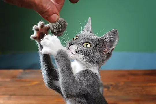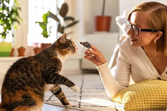 Когда вернетесь домой, обязательно уделите активным играм с кошкой хотя бы 5 минут, подразните ее «удочками» с перьями. Самостоятельные игры – это хорошо, но кошки любят охотиться за движущимися объектами.